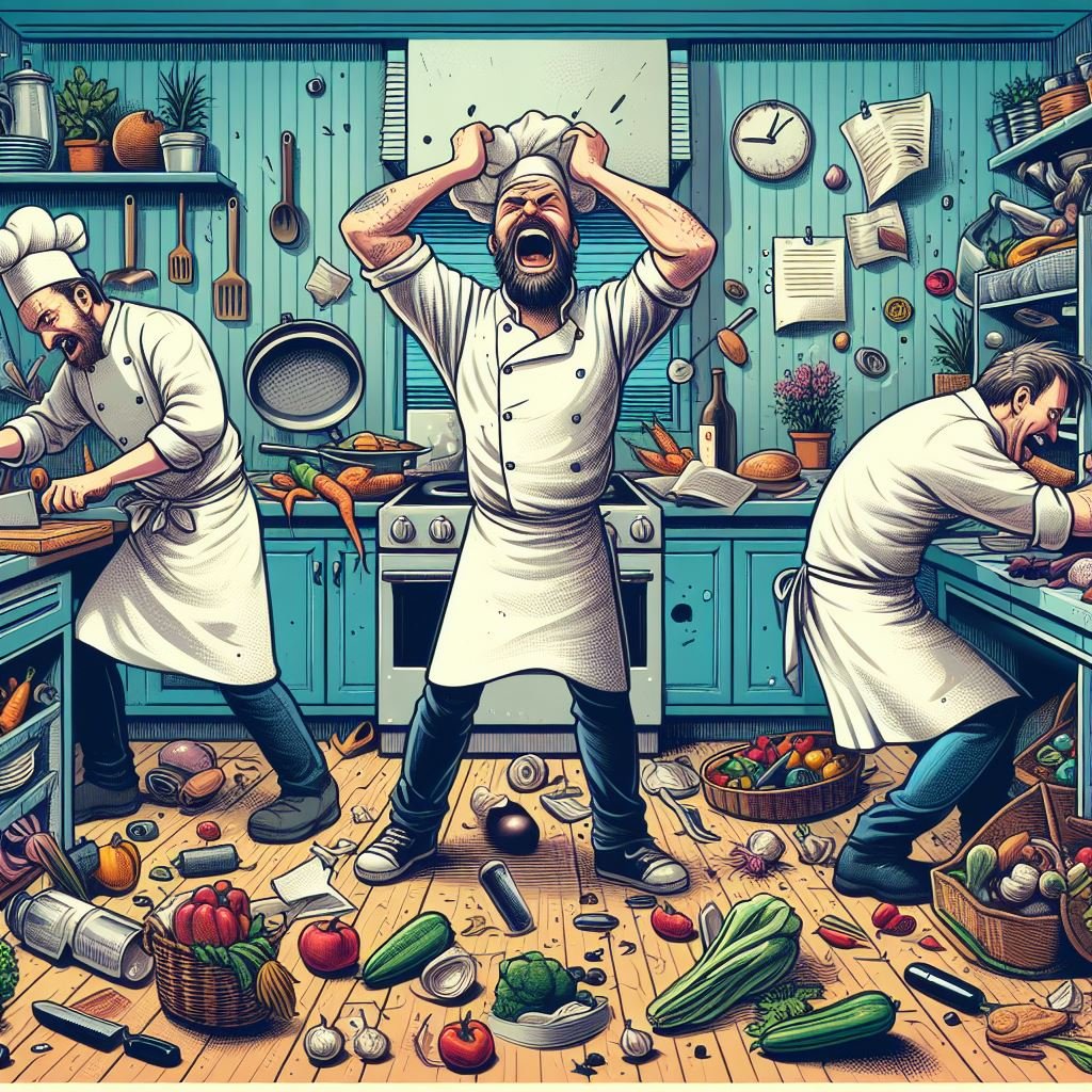 A chaotic kitchen with three chefs working independently. One chops vegetables frantically, another wrestles with a malfunctioning oven, and the third searches through a cluttered pantry.